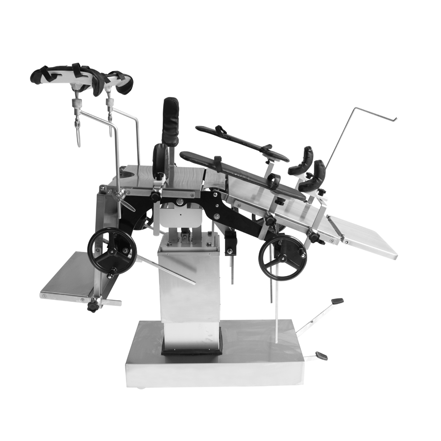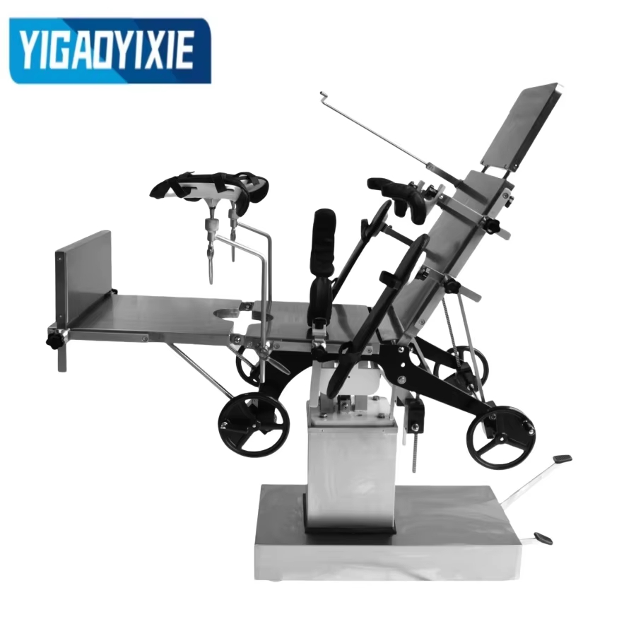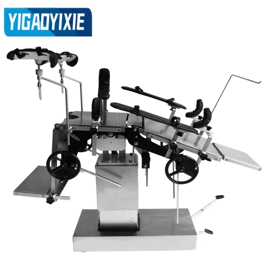 Ang YGS3001 Stainless steel hydraulic operating table ay isang high-performance na medikal na device na idinisenyo para sa pagsuporta sa mga pasyente sa panahon ng operasyon at malawakang ginagamit sa iba't ibang operasyon ng operasyon. Ang operating table ay binubuo ng headboard, backboard, lumbar board, hip board at integral leg board, na maaaring madaling ayusin upang matugunan ang mga pangangailangan ng iba't ibang posisyon sa operasyon. Ang hydraulic lifting system nito ay nagtutulak sa hydraulic oil pump sa pamamagitan ng foot pedal, na madaling patakbuhin, stable at walang ingay, at angkop para sa mga operasyon na nangangailangan ng madalas na pagsasaayos ng taas ng kama. Ang pataas at pababang folding, front at back tilting, kaliwa at kanang tilting ng backboard at leg board ay maaaring tumpak na kontrolin ng mga hand-cranked gear, worm gear at rack system. Ang headboard ay idinisenyo gamit ang isang spiral lock, at ang lumbar board ay inaayos ng isang hand crank upang matiyak ang katatagan at kaligtasan. Ang operating table top ay gawa sa spray-coated na carbon steel, na matibay at madaling linisin. Ang base at column shell ay gawa sa hindi kinakalawang na asero, na lumalaban sa kaagnasan at anti-oxidation, na tinitiyak ang katatagan at hitsura ng kagamitan para sa pangmatagalang paggamit.