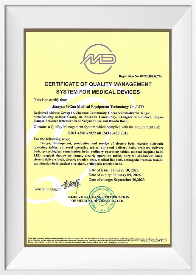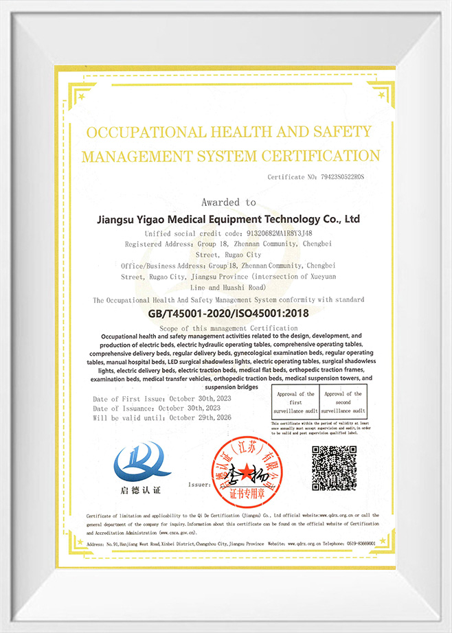 Bilang isang negosyo na lumipas na ISO 9001, ISO 13485, ISO 14001, ISO 45001 , at iba pang mga sertipikasyon ng sistema ng pamamahala, itinuturing ng Jiangsu Yigao Medical Equipment Technology Co., Ltd. ang kalidad ng produkto bilang buhay nito. Ang aming mga operating table ay mahigpit na sumusunod sa Mga pamantayan ng CE , na nangangahulugang hindi lamang nila natutugunan ang mga kinakailangan sa kaligtasan, kalusugan, at kapaligiran ng European market ngunit kinakatawan din nila ang internasyonal na nangungunang antas sa disenyo at pagmamanupaktura ng produkto.
