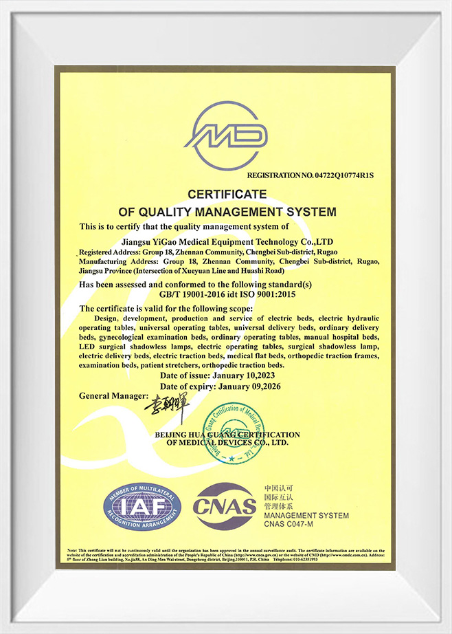 Bilang isang negosyo na lumipas na ISO 9001, ISO 13485, ISO 14001, ISO 45001 , at iba pang mga sertipikasyon ng sistema ng pamamahala, itinuturing ng Jiangsu Yigao Medical Equipment Technology Co., Ltd. ang kalidad ng produkto bilang buhay nito. Ang aming mga operating table ay mahigpit na sumusunod sa Mga pamantayan ng CE , na nangangahulugang hindi lamang nila natutugunan ang mga kinakailangan sa kaligtasan, kalusugan, at kapaligiran ng European market ngunit kinakatawan din nila ang internasyonal na nangungunang antas sa disenyo at pagmamanupaktura ng produkto.